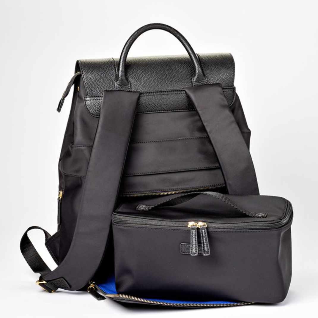 The Mariah Backpack from Minkeeblue is a patented organizational travel and work bag designed to eliminate the need to carry multiple bags while commuting to work. The bag includes a folding "shelf" that allows you to convert the bag from one to two compartments for easy storage of shoes, lunch, gym clothes, purse essentials and laptop. Buy now and get your vegan leather Minkeeblue backpack with a BONUS insulated nylon lunch box and a BONUS shoe bag.