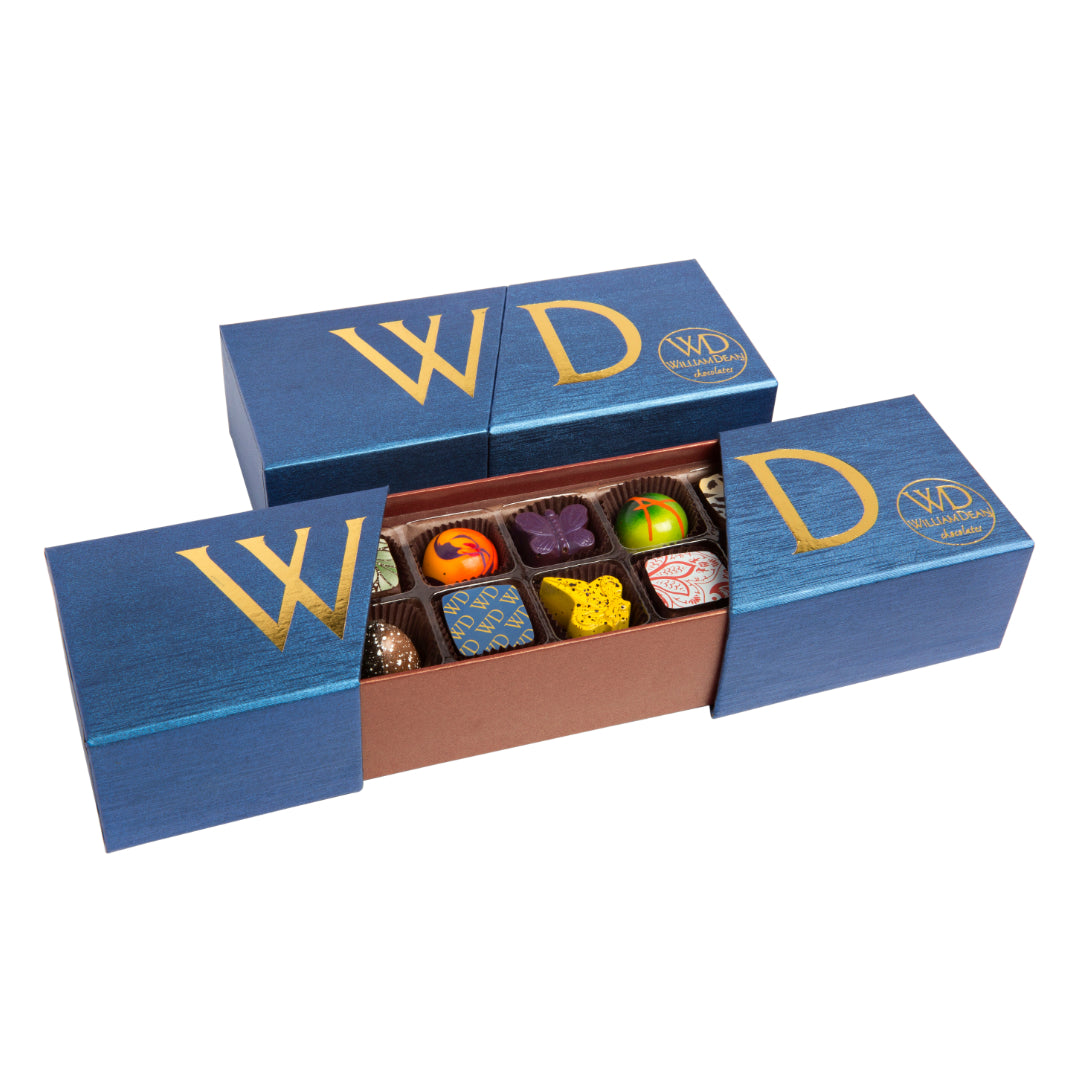 A 20 piece assortment of our signature artisan chocolates, presented in our elegant blue packaging. William Dean Chocolates have been ranked among the world’s finest chocolates and are artisan crafted, preservative-free, and 100% delicious. Each one is truly a small piece of art. Each chocolate is airbrushed and painted so no two are ever alike and then with careful craftsmanship, little masterpieces are created. Order now and receive FREE SHIPPING!